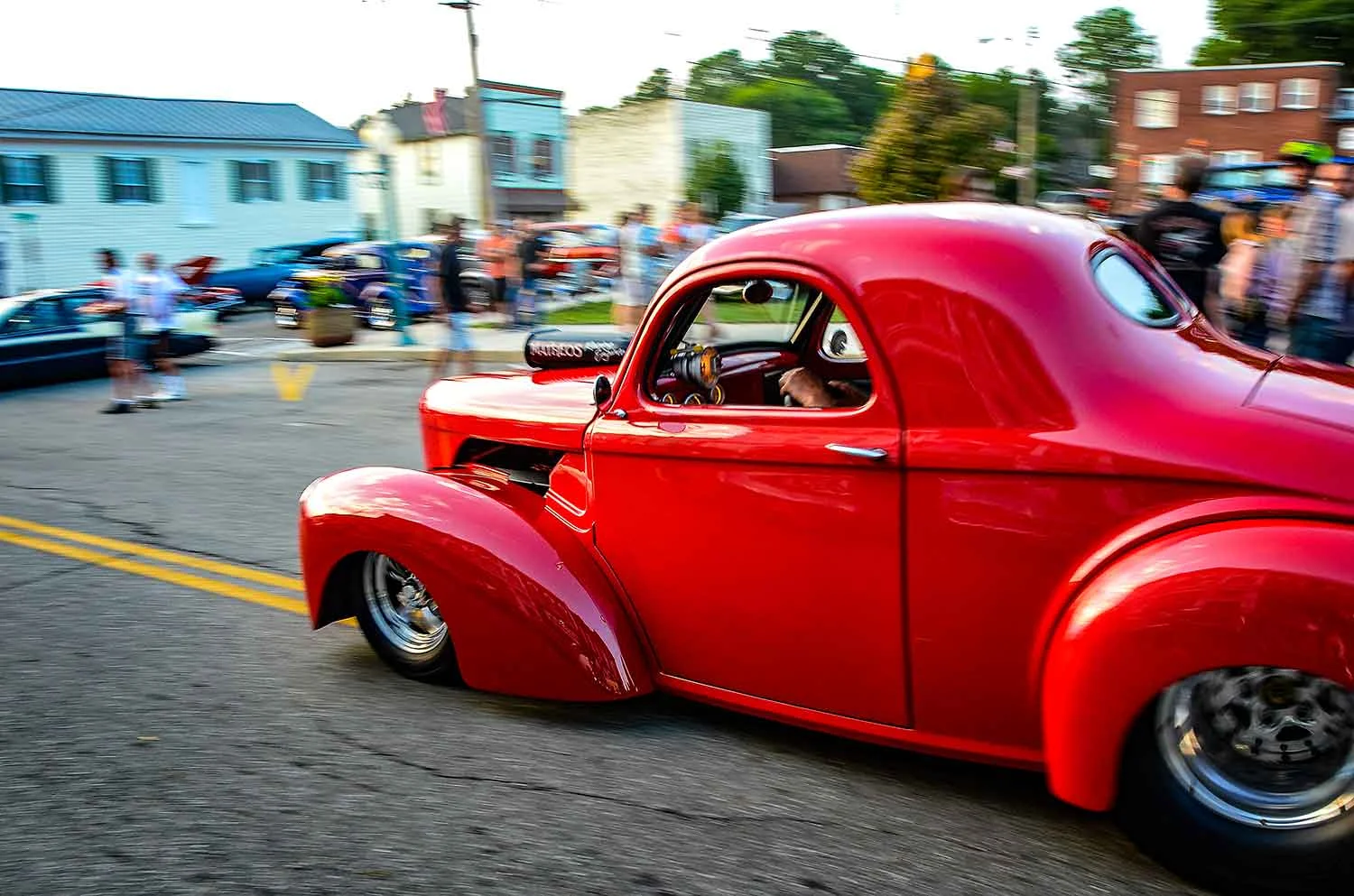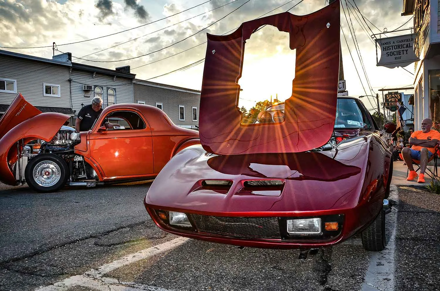 After rain-outs in May and June, the weather finally permitted a car cruise on Main Street in Garrettsville on Saturday evening, July 27. This is my favorite venue for car cruise events. Love that the street is closed off to through traffic and we’re free to wander about with the historic storefronts forming an ideal backdrop. The show was well attended and it was great to see people out enjoying themselves. Mayor Rick Patrick and Jerry Kehoe were on hand to emcee and present awards. Live music was provided by the Legacy band. And of course many great old cars and their owners. As always, a great sense of Americana in a small town event. By this point in the summer, the event spans from full daylight into early twilight. My early shots have the wonderfully rich golden glow of early evening. But I live for the later phase in the last hour before sunset when the sky begins to darken and wonderful shadows and backlighting emerge. I always linger for a bit to capture motion blue shots as the cars begin to depart.