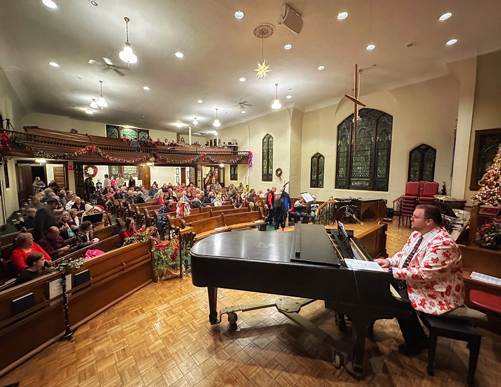 The iconic Hiram church is the perfect venue for a holiday concert. The imposing Victorian architecture seems to soar overhead as you approach the building. The glow of the enormous stained glass windows added a wonderful sense of warmth on the chilly December evening. Entering the church is like pulling on a favorite sweater on a winter day. Itās not just the warmth but the sense of comfort that it brings. Weāve all experienced a range of emotions in this church, everything from joy to sorrow. It encapsulates the emotion of the community, and walking in this space you can feel a cumulative effect of the generations that have worshipped here. It reminds me in a way of a haunted house where only good spirits reside. The good cheer and holiday music put this over the top in terms of fellowship of community.