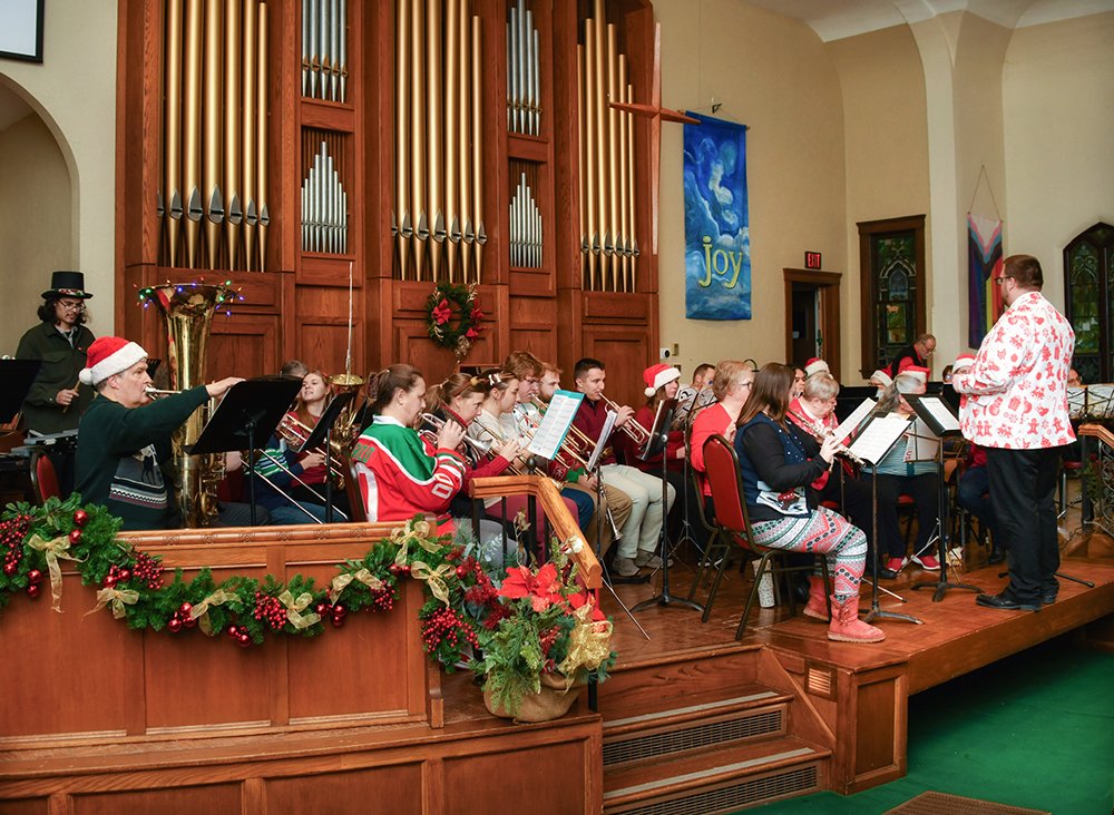 The third annual Holiday Extravaganza concert was held on December 17th at the Hiram Christian Church in Hiram Village, Ohio. The Hiram Community Concert Band performed a selection of holiday music under the direction of Dr. Issac Winland of Hiram College. There was also a performance the Hiram Community Chamber Singers led by Dr. Rosemary Heredos. In addition, Michael Delaney and Theda Hallam performed on guitar and cello.