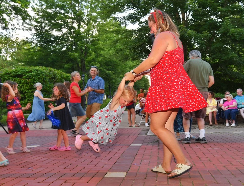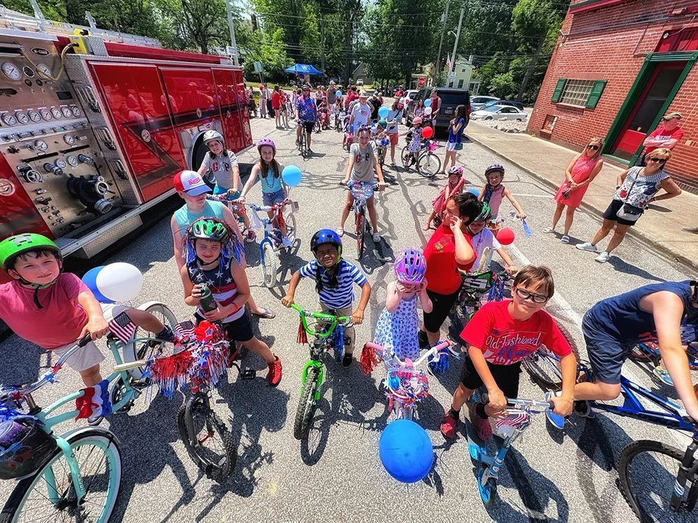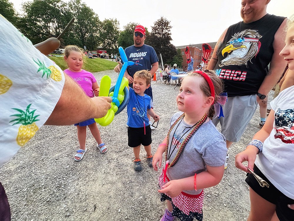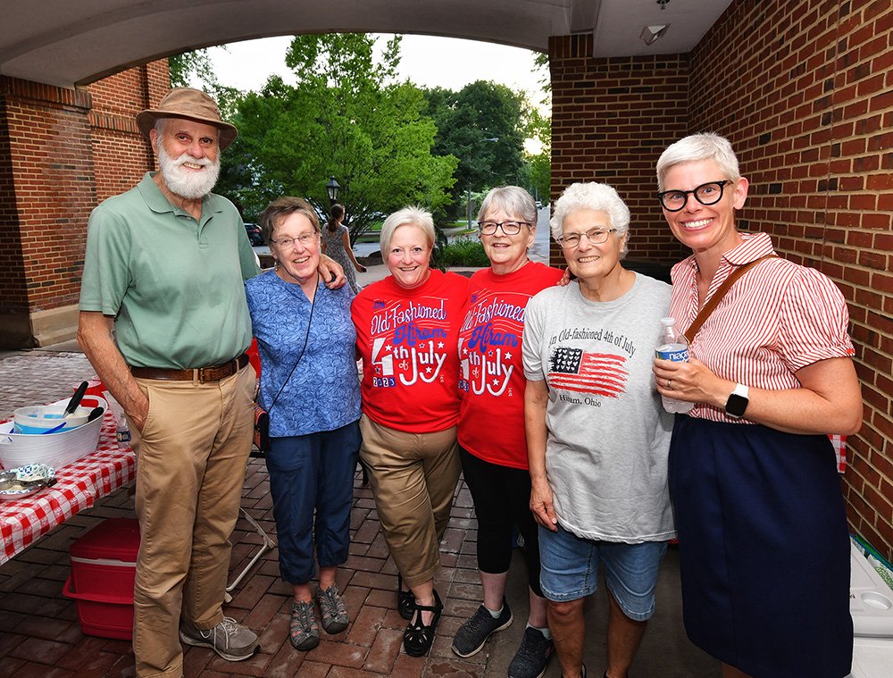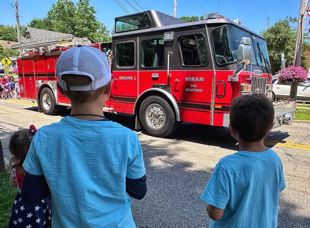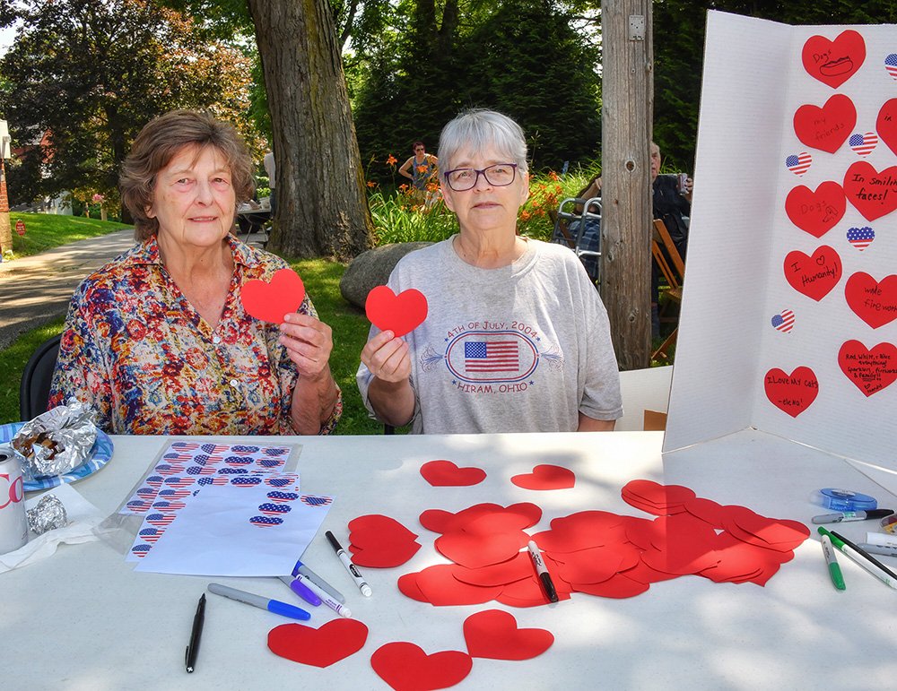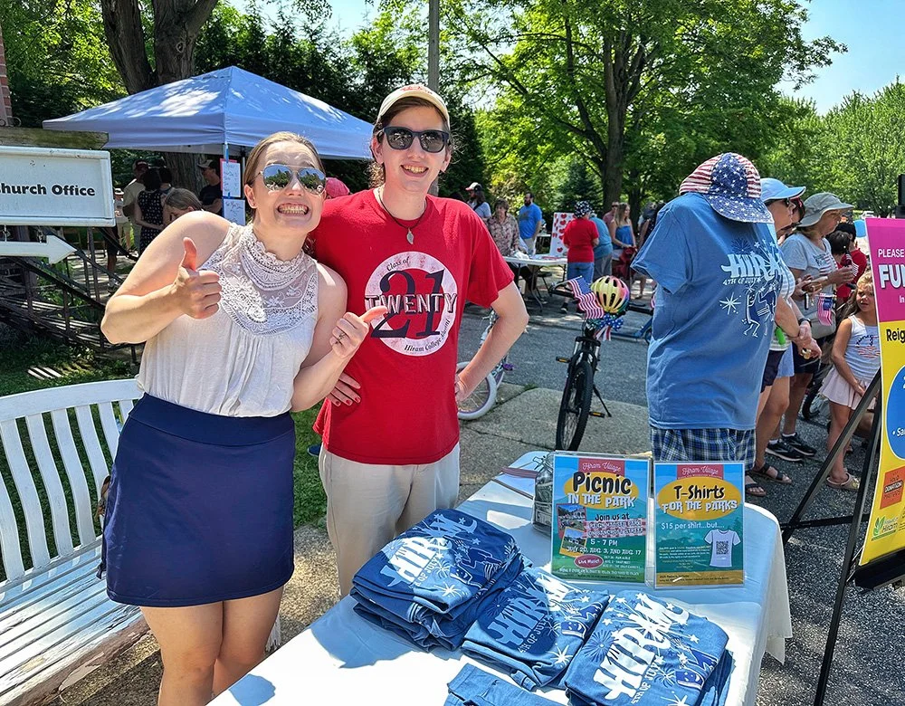 Hiram embraces Independence Day with community-wide activities that serve as the cornerstone event of the summer. This year was no exception with the July 3 evening gathering near the Hiram College athletic field for a concert, food vendors, and balloon artist. Sales were brisk at the commemorative Hiram July 4th t-shirt concession. The event culminated with a welcome from Mayor Anne Haynam, the national anthem sung by Lorena Vines, and the fireworks show to close the evening. July 4 began with the annual softball game where the youthful team completes against the more mature players (the youth won this year). The bike rodeo, cookout, and Hiram Historical bake sale followed over at the Hiram Christian Church parking lot. This was followed the by the parade which featured recently retired police chief Brian Gregory as Grand Marshall and followed by fire trucks and a small army of kids on decorated bikes. Kids activities filled the early afternoon, followed by the Hiram Community band concert under the direction of Issac Winland. The Village was filled with the sounds of the Garretttones in the evening as people danced on the Oliver Plaza during the ice cream social.