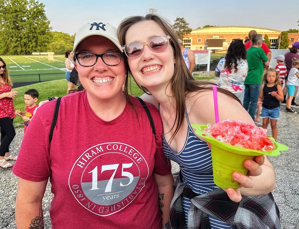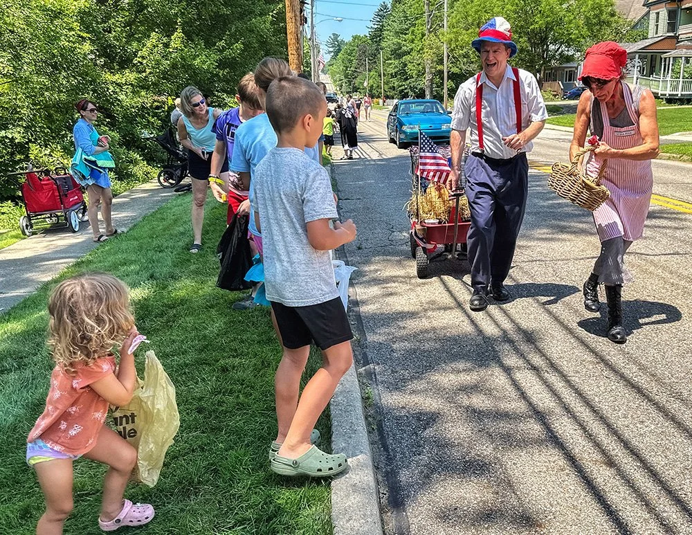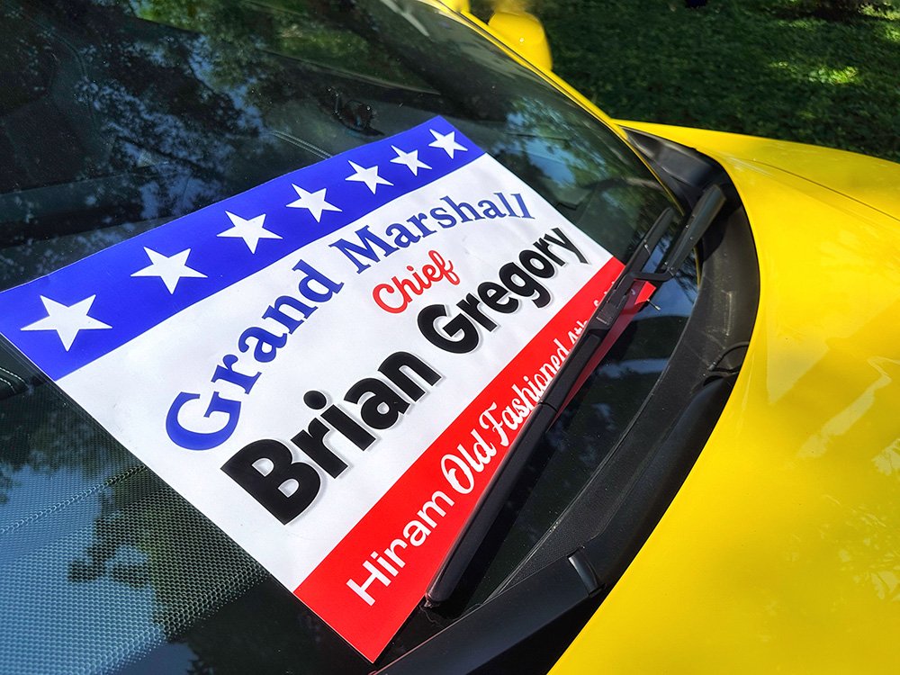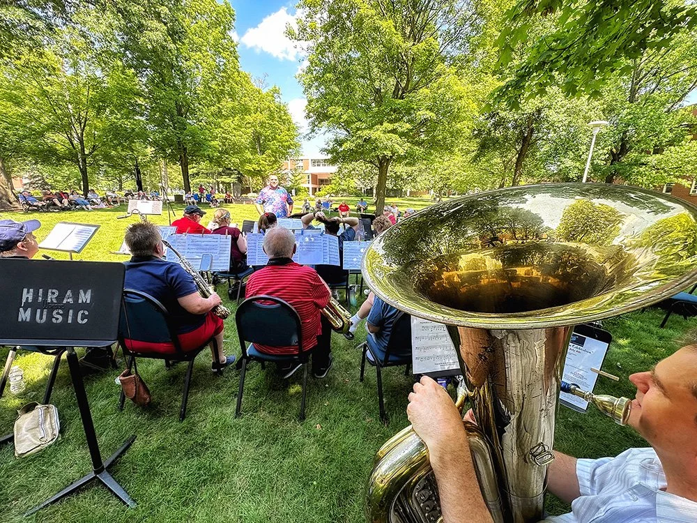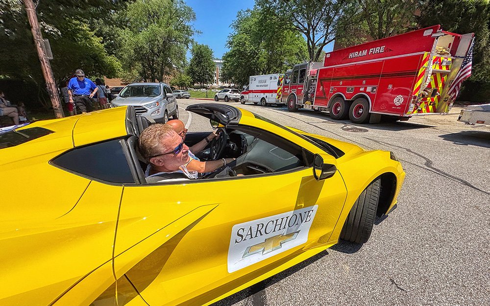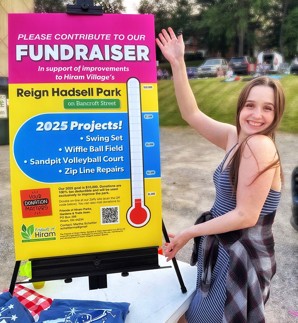 Hiram embraces Independence Day with community-wide activities that serve as the cornerstone event of the summer. This year was no exception with the July 3 evening gathering near the Hiram College athletic field for a concert, food vendors, and balloon artist. Sales were brisk at the commemorative Hiram July 4th t-shirt concession. The event culminated with a welcome from Mayor Anne Haynam, the national anthem sung by Lorena Vines, and the fireworks show to close the evening. July 4 began with the annual softball game where the youthful team completes against the more mature players (the youth won this year). The bike rodeo, cookout, and Hiram Historical bake sale followed over at the Hiram Christian Church parking lot. This was followed the by the parade which featured recently retired police chief Brian Gregory as Grand Marshall and followed by fire trucks and a small army of kids on decorated bikes. Kids activities filled the early afternoon, followed by the Hiram Community band concert under the direction of Issac Winland. The Village was filled with the sounds of the Garretttones in the evening as people danced on the Oliver Plaza during the ice cream social.